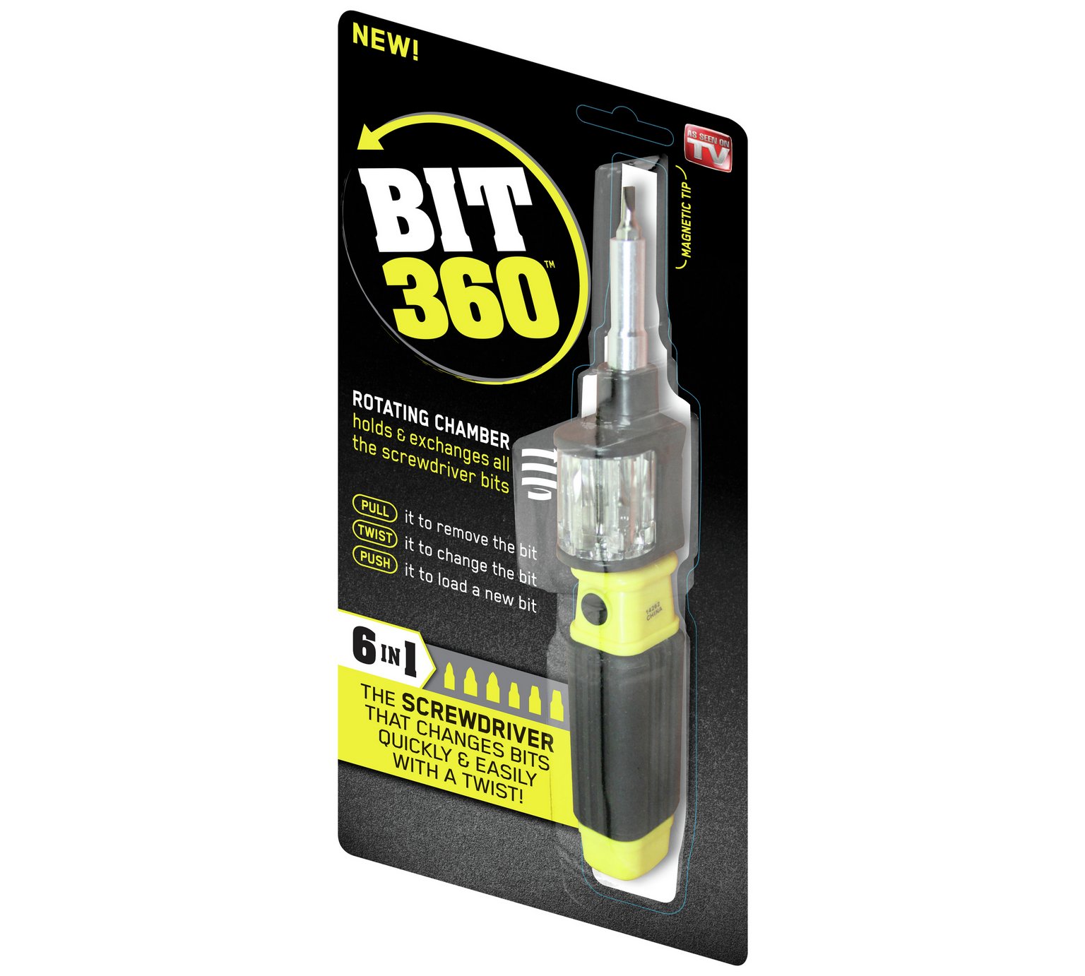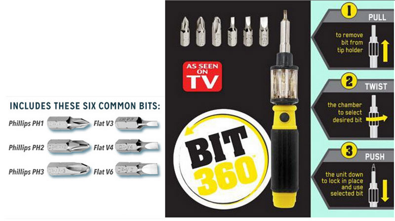 Bit 360 is the revolutionary, easy to use screwdriver that everyone should own. BIT 360 is magnetized, so the screw stays securely on the bit without falling, change bits easily & quickly with a twist. BIT 360 comes with 6 pre-loaded bits to fit virtually any screw, or add your own bits to get a grip on any job around the house, in the workshop, the garage or on the jobsite.
