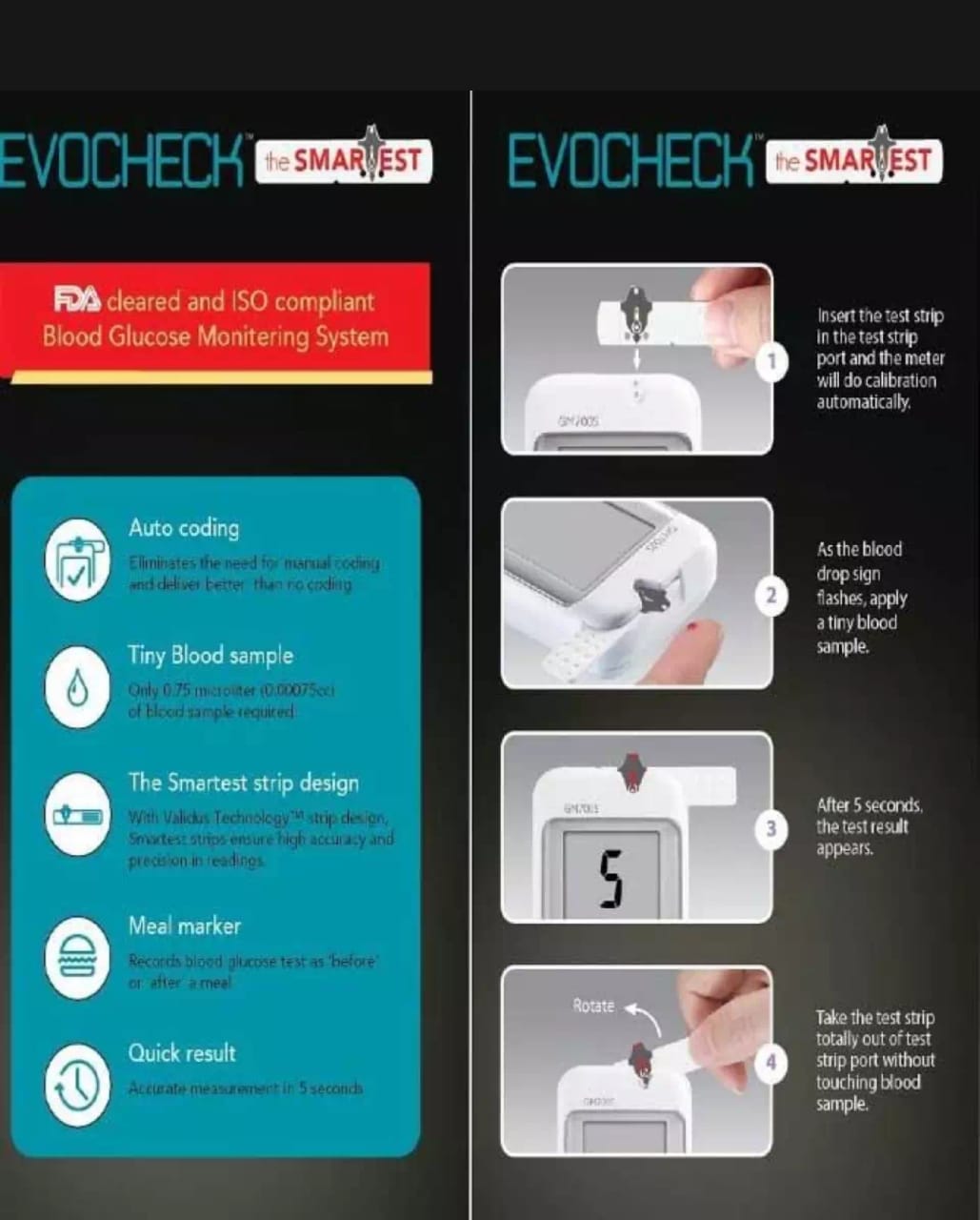 Tiny blood sample (only 0.75 ul of blood sample required)Quick Result (Accurate measurement in 5seconds)WIDE HCT range (Tests capillary, venous, arterial & neonatal blood)Auto Coding (EVOCHEK is the only device which has auto coding feature that eliminates the need for manual coding and delivers better accuracy than no coding)Proprietary Rightest Strip